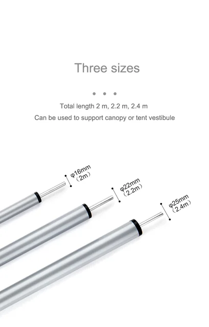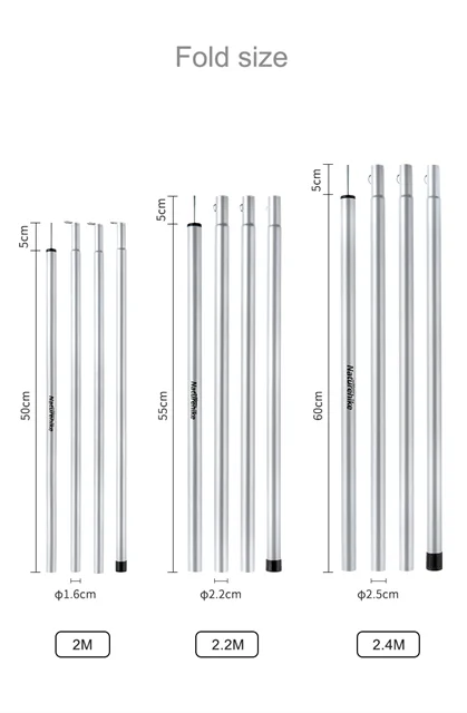 تیرک ها بصورت 1 جفت ارایه می شود.قطر تیرکها با طول تیرک تغییر میکند(مراجعه به عکسهای محصول).این میله سایبان Naturehike دارای 4 بخش است که می توانید ارتفاع را با توجه به موقعیت خود تنظیم کنید. وارد 2 متر، 2.2 متر، 2،4 متر شوید