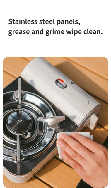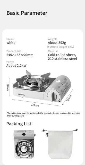 اجاق گاز مسافرتی Naturehike CNK2350CF016 طراحی منظمی دارد. سوخت کپسول بوتان استوانه ای و همچنین یک سیستم شعله افکن و خطوط لوله گاز که برای استفاده ایمن هستند. یک ساختار قابل اعتماد، یک طراحی همه کاره، مفید در زندگی، برای برنامه های سفر شما.این اجاق فضای کمی اشغال میکند و سبک است.با این حال شعله قدرتمند 3000 واتی دارد.به مدت 4 ساعت با یک مینی مخزن گاز استاندارد شعله میدهد.بدنه از فولاد نورد سرد، فولاد ضد زنگ 210.ابعاد تقریبی 245 × 185 × 90 میلی متر و وزن تقریبی 892 گرم