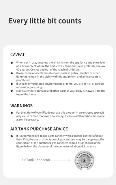 - استفاده از مخزن گاز بوتان با درجه بالای 95% توصیه میشود.استفاده از دیگر کپسول های گاز ممکن است خطرناک باشد.
