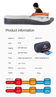 کیسه خواب NatureHike ARCTIC-17 Arctic Alpine Goose Down Mummy (NH19YD005)، این کیسه خواب برای آب و هوای سرد به ویژه کمپینگ زمستانی و کوهنوردی مناسب است. این شامل پر غاز سفید باکیفیت و یک طرح لایهبندی ویژه است تا از راحتی و گرما در آب و هوای شدید اطمینان حاصل کند. علاوه بر این، ضد آب و تنفس برای مقابله با تغییرات آب و هوایی مختلف است.محتوای پایین 95٪، قدرت پر کردن 850FP، و ظرفیت پر کردن پایین 1000 گرم تا 1300 گرم است. این محصول محاسبات علمی میزان پر کردن هر کانال مخملی را به کار میگیرد و عملکرد عایق حرارتی را کاملاً بازی میکند. این محصول از نایلون نرم، سازگار با پوست، تنفس و ضد پاشش ساخته شده است که می تواند به طور موثر با تغییر آب و هوای بیرون از خانه مقابله کند. اندازه محصول 200x75 سانتی متر، وزن آن حدود 1680 گرم یا 2050 گرم و ابعاد ذخیره سازی به ترتیب Ø23×42cm و Ø26×45cm است. محصولات دارای محدوده دمای آسایش متفاوت و محدوده دمای شدید هستند که می توانند با محیط های آب و هوایی مختلف کنار بیایند