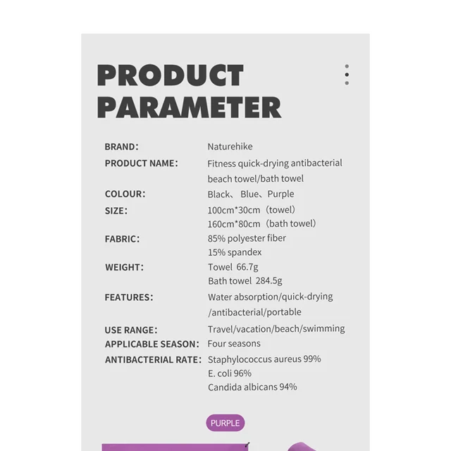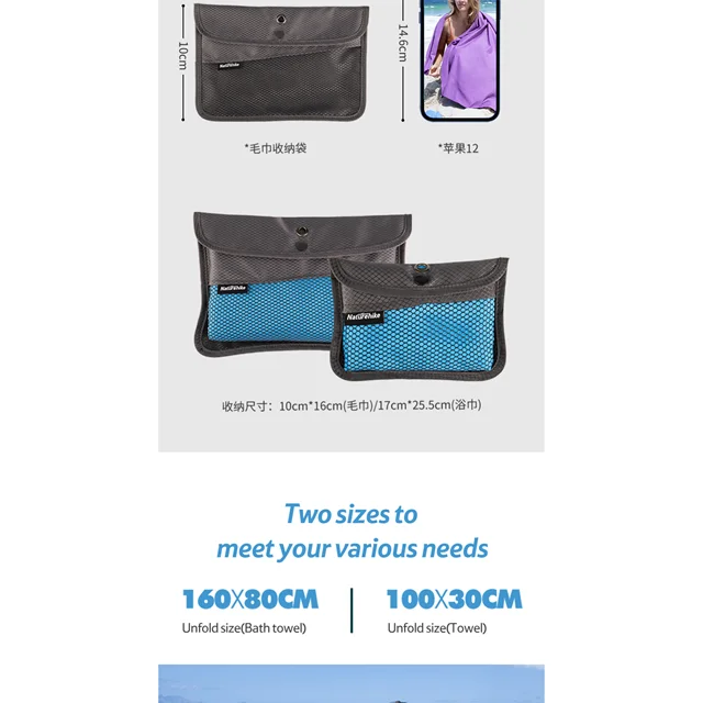 حوله نیچرهایک سبک، جمع و جور و سریع خشک می شود و می توانید در سفر، کمپینگ،استخر یا رفتن به باشگاه از آن استفاده کنید.در استخر شنا و لذب آفتاب گرفتن و یا برنامه کمپینگ کنار ساحل و دریاچه با توجه به خاصیت خشک شوندگی سریع میتوانید به دفعات از این حوله استفاده کنید.حوله نیچرهایک در کمتر از 5 دقیقه زیر نور خورشید خشک می شود و با توجه به جنس الیاف بکار رفته در آن سازگار با هر نوع پوست است و هیچگونه باکتری فرصت رشد و تکثیر روی حوله را پیدا نمی کند.